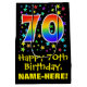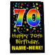 This exciting, vibrant, and fun birthday themed gift bag design features a large number "70" with a rainbow spectrum gradient inspired pattern, along with the message "Happy 70th Birthday,", and a customisable recipient name. It also has a background pattern featuring star shapes of various sizes and colours. A gift bag like this might be used when giving a gift or present in honour of somebody’s seventieth birthday. [~Z0000510]