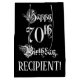 This fancy and formal birthday giftbag design features the message “Happy 70th Birthday,” in elaborate script style text, on a black coloured background. It also has a custom recipient name. An opulent giftbag like this might be a respectable way of wrapping a birthday present or gift being given to somebody who is celebrating their 70th birthday. [~Z0000557]