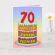 This cheerful and fun birthday greeting card design features a cartoon-style depiction of a three-tier birthday cake having numeral-shaped candles on top showing the number “70“, along with the message “HAPPY 70TH BIRTHDAY,”, and a personalised recipient name. The background of the front features a multicolored pastel rainbow spectrum inspired gradient pattern. The inside features a custom birthday greeting message, or could perhaps be cleared and left blank if a message is to be written by hand instead. A joyful, customised birthday greeting card like this might be a fun way to send birthday greetings to somebody who is celebrating their seventieth birthday. [~Z0000625]
