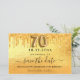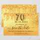 A girly and trendy Save the Date card for a 70th birthday party. A modern faux gold looking background decorated with faux glitter drips, paint dripping look. Personalise and add a date and name. The text: Save the Date is written with a large trendy hand lettered style script. Number 70 with a balloon style font.