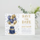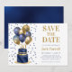 This fabulous men's 70th birthday party Save the Date card featuring a 2-layer navy blue and gold cake with navy blue and gold balloons, the number 70 in gold and shiny blue confetti would be perfect for asking people to put this special date aside for the upcoming 70th Birthday Party. It is traditional and classic while being fresh, modern and contemporary. The back is a coordinating navy blue foil.