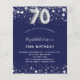 A modern, stylish and glamourous invitation for a 70th birthday party. A navy blue background, decorated with faux silver stars. Personalise and add your name and party details. Number 70 is written with a balloon style font.