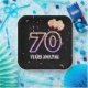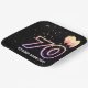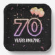Party balloons and confetti on black background with the neon number 70 for a 70th birthday party.