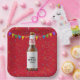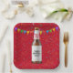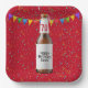 Brown beer bottle with party bunting and colourful confetti on red background for 70th birthday.