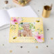 For a 70th summer birthday party. Yellow, white background with a honeycomb pattern. Decorated with pink coloured tropical florals flowers, hibiscus and happy bumble bees. Add your own photo and the age 70. Green coloured letters.