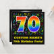 The front of this fun, vibrant, and colourful birthday party invitation design features a large number "70" having a rainbow spectrum gradient inspired pattern. It also features a personalised name and the message "70th Birthday Party!". Part of the background has a fun pattern of various music notes and symbols having a variety of colours and sizes. The back features personalised details/information about the event that the potential guests are being invited to. Happy, customised birthday celebration invitation cards like this might be used when inviting guests to attend a celebratory gathering being held to honour a singer’s, a musician’s, a song composer’s, or somebody else’s 70th birthday. [~Z0000427]