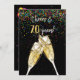 Champagne toast on black with colourful falling confetti for 70th birthday party invite.