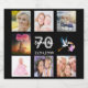 A bottle label for a 70th birthday party, celebrating her life with a collage of 8 of your photos. Templates for a name, age 70 and a date. Date of birth or the date of the party. White and grey coloured letters. Elegant black background.
