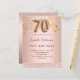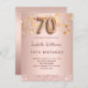A modern, stylish and glamourous invitation for a 70th birthday party. A faux rose gold metallic looking background with faux gold dripping stars. The name is written with a modern dark rose gold coloured hand lettered style script. Personalise and add your party details. Number 70 is written with a balloon style font, script.
