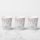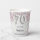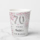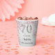 For a glamourous and girly for a 70th birthday party. A faux silver looking background. On the front and the back: Personalise and add a name, and a date. Decorated with pink and faux silver glitter dust. Number 70 is written with a balloon style font.