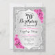 70th Birthday Invitation. Elegant floral design in silver and pink. Features faux glitter silver stripes, pink roses stylish script font and confetti. Perfect for a glam birthday party.
