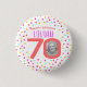 Bright colourful confetti random dots birthday 70th surprise party button. In bright living coral, hot pink, golden yellow and aqua blue green. Add your own birthday girl's photo in the centre of the 0 in 70 and customise with your own seventieth birthday girls name. Other matching items and milestone birthday years available. Original design by www.mylittleeden.com on zazzle.