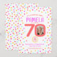 Bright colourful confetti random dots birthday 70th surprise party invitations. In bright living coral, hot pink, golden yellow and aqua blue green. Add your own birthday girl's photo in the centre of the 0 in 70 and customise with your own seventieth birthday date, time and party details. Other matching items and milestone birthday years available. Original design by www.mylittleeden.com on zazzle.