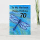 Celebrate your husband's 70th birthday on a brave blue dragonfly card. Created from my original watercolor painting, the whimsical insect flies peacefully by with ocean blue, black and teal green colors. Enjoy the message of congratulations with all your love.