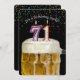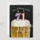 Number 71 candles in mug of beer with colourful confetti on black for 71st birthday party invite.