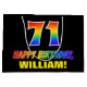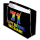 This colourful, cheerful, and fun birthday-themed gift bag design features a large number "71" and the message "HAPPY BIRTHDAY,", both having a rainbow spectrum gradient inspired pattern colouring, along with a bold yellow personalised recipient name. The background is coloured black. A fun gift bag like this might be used when giving a gift or present in honour of somebody’s seventy first birthday. [~Z0000477]