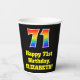 This exciting and fun birthday-themed paper cup design features a large number “71” with a rainbow spectrum gradient inspired pattern, along with the message “Happy 71st Birthday,”, and a personalised name. The background is coloured black. Colourful, vibrant paper cups like this might be fun to have at a birthday celebration being held to honour somebody’s seventy first birthday. [~Z0000537]