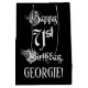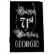This luxurious and elaborate birthday gift bag design features the message “Happy 71st Birthday,” in fancy script style text, on a black coloured background. It also has an editable recipient name. A gift-bag like this might be used when giving a gift or present in honour of somebody’s 71st birthday. [~Z0000557]