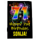 This fun, colourful, and exciting birthday-themed giftbag design features a large number "71" with a rainbow spectrum gradient inspired pattern, along with the message "Happy 71st Birthday,", and a personalised recipient name. It also has a colourful background pattern inspired by the look of bursting celebratory fireworks. A birthday themed gift bag like this might be a fun way to wrap a gift or present being given to somebody who is celebrating their 71st birthday. [~Z0000509]