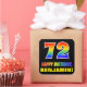 This colourful, cheerful, and fun birthday themed sticker design features a large number "72" and the message "HAPPY BIRTHDAY,", both coloured with a rainbow spectrum gradient inspired pattern, along with a bold yellow personalised name. The background is coloured black. Fun birthday themed stickers like this may be used when wrapping a gift or present being given to somebody who is celebrating their seventy second birthday, or perhaps maybe be handed out to the attendees at a birthday party. [~Z0000480]