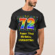 This fun, colourful, and vibrant birthday themed shirt design features a large number "72" with a rainbow spectrum gradient inspired pattern, along with the message "Happy 72nd Birthday,", and a customisable name. A vibrant, colourful pattern of various music notes and music symbols appears behind the rainbow-coloured birthday number. Fun, customised birthday-themed shirts like this might be worn by the attendees at a birthday party being held to honour a musician’s, a song composer’s, a singer’s, or somebody else’s seventy second birthday. [~Z0000428]