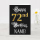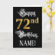 The front of this elaborate and luxurious birthday themed greeting card design features the message “Happy 72nd Birthday,”, plus a customisable recipient name. Some of the message is in an elegant script-style text, the large number “72nd” features a faux/imitation gold-inspired look pattern, and the background is coloured black. The inside has a personalised birthday greeting message, or could perhaps be cleared and left blank if a message is to be written by hand instead. A formal, personalised birthday greeting card like this might be a respectable way to send birthday greetings to somebody who is celebrating their seventy-second birthday. [~Z0000559]