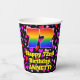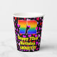 This happy and cheerful birthday paper cup design features a large number “72” with a rainbow spectrum gradient inspired pattern, along with the message “Happy 72nd Birthday,”, and a personalised name. The background features a pattern of purple, red, and pink heart shapes of various sizes. Upbeat, joyful paper cups like this might be fun to have at a birthday party being held in celebration of somebody’s seventy second birthday. [~Z0000548]