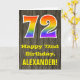The front of this colourful yet rustic birthday-themed greeting card design features a large number "72" with a rainbow spectrum gradient inspired pattern, along with the message "Happy 72nd Birthday,", and a personalised recipient name. The front features a background depicting a rustic faux wood grain inspired pattern. The inside features a customisable birthday greeting message, or could perhaps be cleared and left blank if a message is to be written by hand instead. A customisable birthday card like this might be a fun way to send birthday wishes to somebody who is celebrating their seventy second birthday. [~Z0000419]