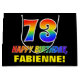 This colourful, cheerful, and fun birthday-themed gift bag design features a large number "73" and the message "HAPPY BIRTHDAY,", both having a rainbow spectrum gradient inspired pattern colouring, along with a bold yellow personalised recipient name. The background is coloured black. A fun gift bag like this might be used when giving a gift or present in honour of somebody’s 73rd birthday. [~Z0000477]