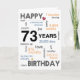 Let's commemorate the incredible 73rd birthday milestone with our delightful Happy 73rd Birthday card! Whether it's for your cherished mum, beloved dad, dear brother, or beloved sister, this card provides a lovely avenue to express your heartfelt wishes and shower them with joy and love on their special day. The front of the card proudly displays "Happy Birthday" alongside the significant number 73, depicted in decades, years, months, weeks, days, hours, minutes, and seconds, underscoring the significance of this momentous occasion.