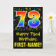 The front of this fun, colorful, and vibrant birthday greeting card design features a large number "73" with a rainbow spectrum gradient inspired pattern, along with the message "Happy 73rd Birthday,", and a personalized recipient name. The front also has a pattern of various music notes and symbols having a variety of colors and sizes. The inside features a custom birthday greeting message, or could perhaps be cleared and left blank if a message is to be written by hand instead. A personalized birthday card like this might be a fun way to send birthday wishes to a musician, singer, composer, or somebody else who is celebrating their seventy third birthday. [~Z0000420]