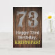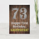 This western inspired and country look birthday themed greeting card design features a large rustic look number "73", the message "Happy 73rd Birthday,", a custom name, and a faux/imitation wood grain inspired look pattern background. The inside has a customised birthday greeting message, or could perhaps be cleared and left blank if a message is to be written by hand instead. A personalised birthday greeting card like this might be sent in celebration of somebody’s seventy-third birthday. [~Z0000469]