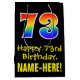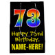This fun, exciting, and colourful birthday-themed giftbag design features a large number "73" with a rainbow spectrum gradient inspired pattern, along with the message "Happy 73rd Birthday,", and a customisable recipient name. The background is coloured black. A gift bag like this might be used when wrapping gifts being given to somebody in celebration of their 73rd birthday. [~Z0000512]