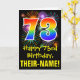 The front of this fun, exciting, and colourful birthday greeting card design features a large number "73" with a rainbow spectrum gradient inspired pattern, along with the message "Happy 73rd Birthday,", and a personalised recipient name. The front additionally features a colourful background pattern inspired by the appearance of bursting celebratory fireworks. The inside features a customised birthday greeting message, or could perhaps be cleared and left blank if a message is to be written by hand instead. A birthday card like this might be a fun way to send birthday wishes to somebody who is celebrating their seventy third birthday. [~Z0000442]