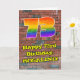 This fun and exciting urban graffiti and street art themed birthday greeting card design features a large number “73” with a colorful rainbow spectrum gradient inspired pattern, along with the message “Happy 73rd Birthday,”, and a customizable name. The background of the front features a brick wall pattern. The inside has a custom birthday greeting message, or could perhaps be cleared and left blank if a message is to be written by hand instead. A vibrant, customizable birthday greeting card like this might be sent to celebrate somebody’s seventy-third birthday. [~Z0000586]