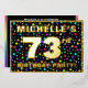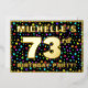 The front of this joyful seventy-third birthday celebration/party foil invitation card design features a personalised name, a large number “73rd”, the message “BIRTHDAY PARTY!”, and a border. The background of the front features a fun, colourful star shapes pattern. The back features personalised details about the event, such as the date, time, venue/location, and any other information that may be relevant. Editable invitations like these might be a fun way to invite guests to a birthday gathering being held to honour somebody’s 73rd birthday. [~Z0000600]
