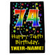 This fun, colourful, and exciting birthday giftbag design features a large number "74" with a rainbow spectrum gradient style pattern, along with the message "Happy 74th Birthday,", and a customisable recipient name. It also has a background pattern featuring star shapes of various sizes and colours. A birthday themed gift bag like this might be a fun way to wrap a gift or present being given to celebrate somebody’s 74th birthday. [~Z0000510]