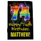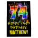 This fun, exciting, and colourful birthday gift bag design features a large number "74" with a rainbow spectrum gradient style pattern, along with the message "Happy 74th Birthday,", and a personalised recipient name. It also has a colourful background pattern inspired by the look of bursting celebratory fireworks. A giftbag like this might be used when giving a gift or present in honour of somebody’s seventy fourth birthday. [~Z0000509]