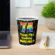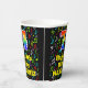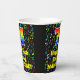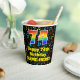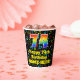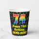 This cheerful and exciting music themed birthday paper cup design features a large number “74” with a rainbow spectrum gradient inspired pattern, along with the message “Happy 74th Birthday,”, and a customisable name. The background features a colourful pattern having music notes and symbols of various sizes and colours. Colourful, vibrant paper cups like this might be fun to use at a birthday party being held to celebrate somebody’s 74th birthday. [~Z0000541]