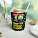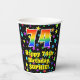 This joyful and colourful birthday-themed paper cup design features a large number “74” with a rainbow spectrum gradient inspired pattern, along with the message “Happy 74th Birthday,”, and a custom name. The background features a colourful pattern featuring many star shapes with different colours and sizes. Colourful, vibrant paper cups like this might be fun to have at a birthday party being held to honour somebody’s seventy fourth birthday. [~Z0000540]