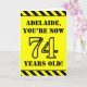 The front of this fun and bold birthday themed greeting card design features a personalised name and the message "YOU’RE NOW 74 YEARS OLD!" in black stencil style text on a yellow coloured background. The front also features an eye-catching black and yellow stripes pattern at the top and bottom edges. The inside features a customisable birthday greeting message, or could perhaps be cleared and left blank if a message is to be written by hand instead. A personalised birthday card like this might be a fun way to send a message in celebration of somebody’s seventy fourth birthday. [~Z0000413]