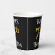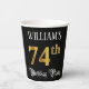 This fancy and luxurious birthday themed paper cup design features a customisable name and the message “74th Birthday Party”. The large number “74th” has an imitation/faux gold-inspired colouring pattern, and the words “Birthday Party” are in ornate script-style text. The background is coloured black by default (although it can be customised). Opulent, ornate paper cups like this might be used at a birthday celebration being held to honour somebody’s 74th birthday. [~Z0000567]