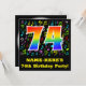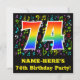 The front of this fun, colourful, and vibrant birthday party invitation design features a large number "74" with a rainbow spectrum gradient inspired pattern, along with a customisable name and the message "74th Birthday Party!" Part of the background features a fun and colourful music notes and symbols pattern. The back features editable information pertaining to the event that the potential guests are being invited to. Happy, editable birthday party invitation cards like this might be used when inviting guests to attend a gathering being held to celebrate a song composer’s, a musician’s, a singer’s, or somebody else’s seventy fourth birthday. [~Z0000427]