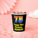 This fun and exciting birthday-themed paper cup design features a large number “75” with a rainbow spectrum gradient inspired pattern, along with the message “Happy 75th Birthday,”, and an editable name. The background is coloured black. Vibrant, colourful paper cups like this might be fun to use at a birthday party/celebration being held to celebrate somebody’s 75th birthday. [~Z0000537]