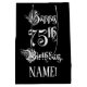 This formal and elegant birthday themed gift bag design features the message “Happy 75th Birthday,” in luxurious script style text, on a black coloured background. It also features a personalised recipient name. A gift-bag like this might be a respectable way of wrapping a birthday present or gift being given to somebody who is celebrating their seventy fifth birthday. [~Z0000557]