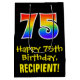 This exciting, fun, and colourful birthday-themed giftbag design features a large number "75" with a rainbow spectrum gradient style pattern, along with the message "Happy 75th Birthday,", and a personalised recipient name. The background is coloured black. A birthday themed gift-bag like this might be used when giving a gift or present in celebration of somebody’s seventy fifth birthday. [~Z0000512]