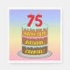 This cheerful and fun birthday-themed paper napkin design features a cartoon-style depiction of a three-tier birthday cake having number-shaped candles on top showing the age “75“, along with the message “HAPPY 75TH BIRTHDAY,”, and an editable recipient name. The background has a multi-colour pastel rainbow spectrum inspired gradient pattern. Paper napkins like these might be used at a party for somebody who is celebrating their 75th birthday. [~Z0000623]