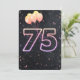 Glowing neon sign and confetti on black background with balloon bouquet for 75th birthday party invite.