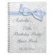 Elegant Seventy fifth Birthday Party guest book women. 75th Birthday Party! Beautiful white damask pattern background with a pretty, stylish romantic blue bow and ribbon image. These glamourous, classy guest books are perfect for women and are decorated / printed on the front side only. Women will love this chic modern birthday party guest book. All text is fully customisable to meet your requirements. PLEASE NOTE: All products on Zazzle have flat printed images. Bow and ribbon images purchased from digital-designs-by-elena. If you need any assistance customising your product please contact me through my store and I will be happy to help.