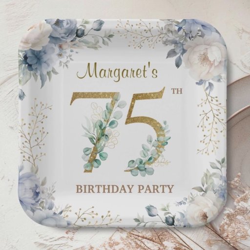 75th Birthday Elegant Gold & Dusty Blue PeonyDesigned by H-Art Studio Design